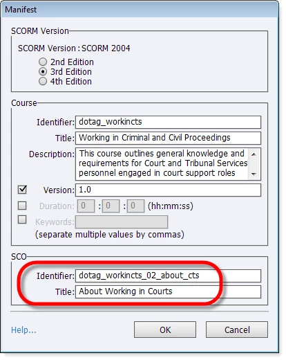 Note that what I'm expecting to see in the TOC of the LMS SCORM Player is the Title field name of the SCO (About Working in Courts in this case).  But what I'm seeing appear is actually not that field, and it's not even the SCO ID field above it.  (I tried changing that field as well to see if its value was what ended up getting written into the imsmanifest.xml for the multi-SCORM package.)