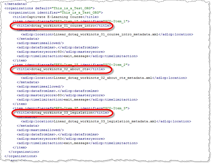 Currently, when I create a Multi-SCORM Package with the Cp7 app, here's what I see in the Title tags of the Organizations block: