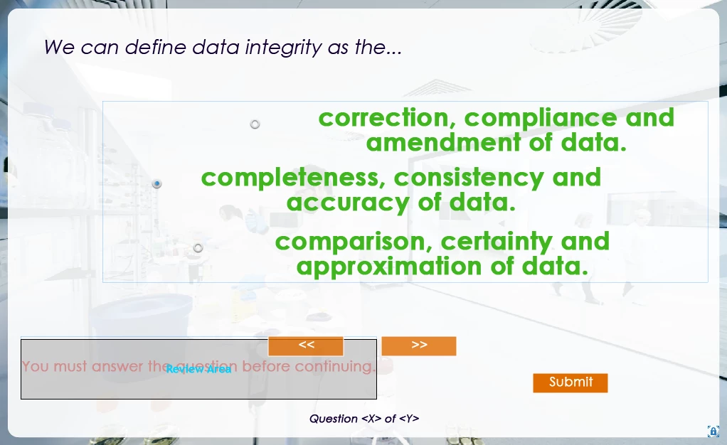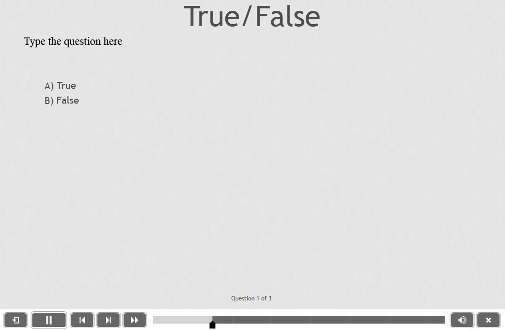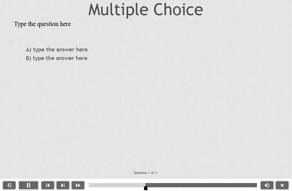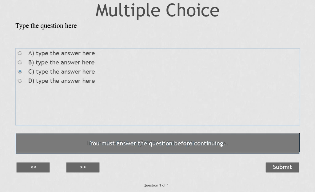 I've built a custom quiz at the end of my course, using a question pool. However, when I was previewing in 'HTML5 in Browser' the multiple choice quiz slides were not working; they would look like this...