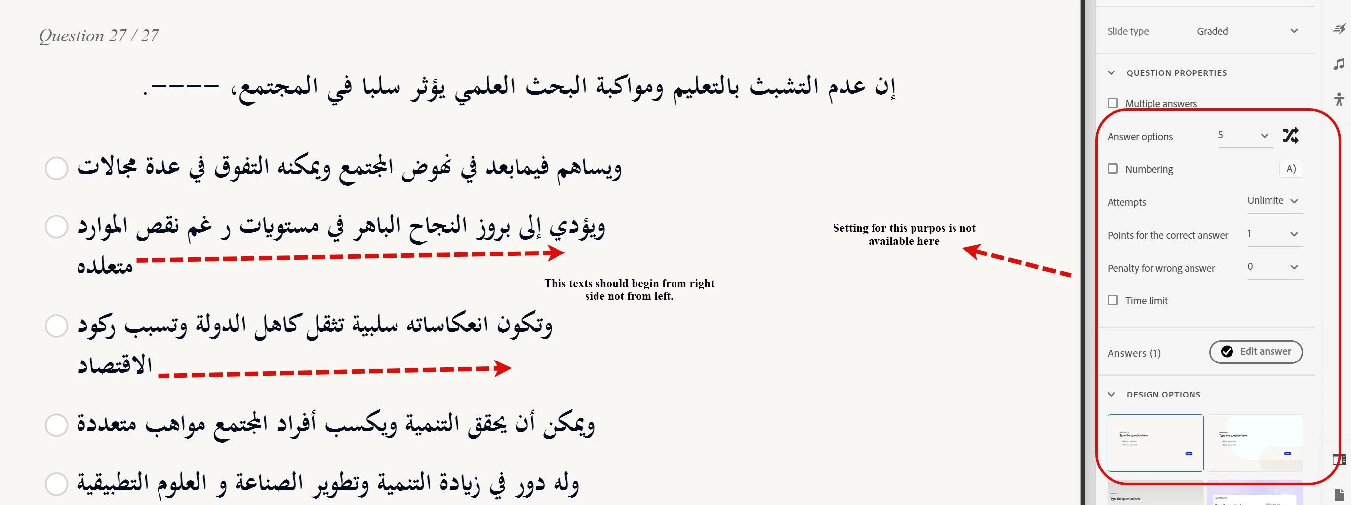 When preparing a multiple choice quiz, we can justify the text to the right or left in the heading section. But this is not possible in the options section. I'm working with a language written from right to left, but I didn't see an option to start the text from the right. Is this possible for the question options?