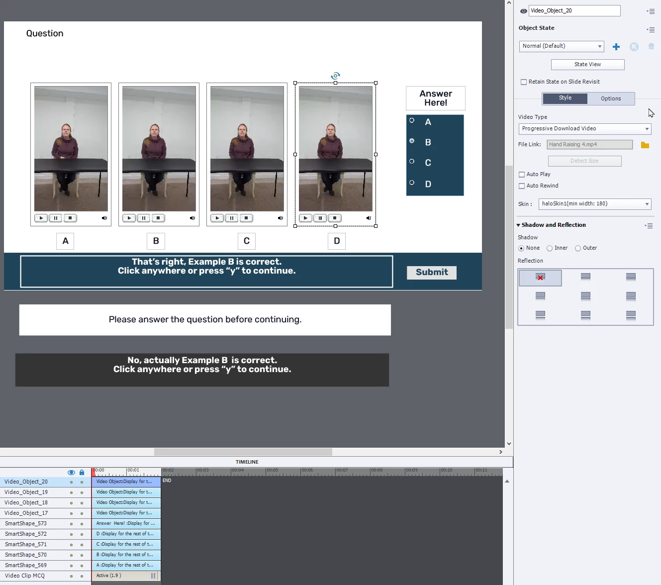 I have a multiple choice quiz question with four 15-second event videos on the screen. The learner should watch them, and then choose an answer based on the videos. (See screenshot; it's hard to explain!)