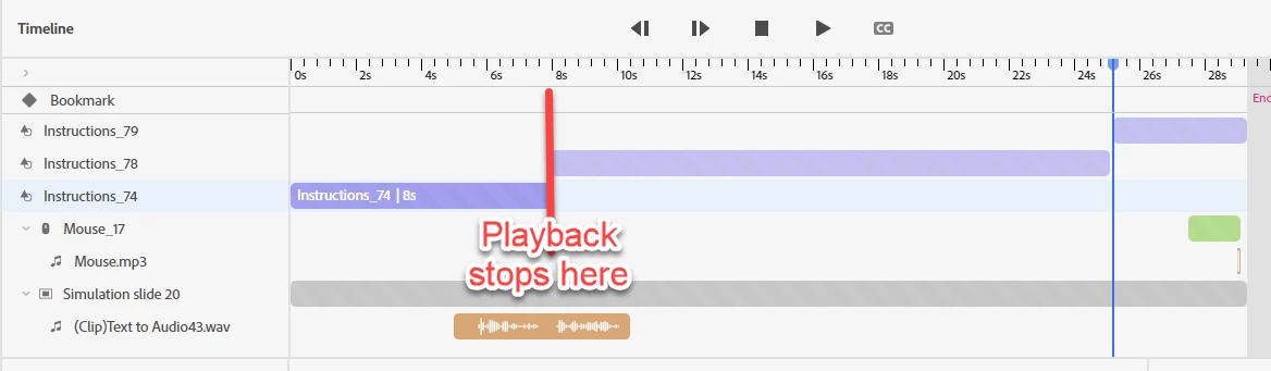 I have a software simultation with a full motion recording slide part way through. I want to add multiple instruction boxes during the FMR playback, but with only one visible at any time. It all works fine when editing, but when I publish the HTML 5, the playback of the FMR stops when the first instruction box disappears. The other instruction boxes appear on cue and the next slide appears when expected.