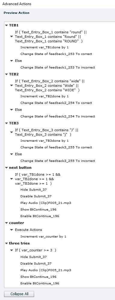 It works in the SWF output, but not HTML5. It just keeps marking all of the answers wrong, even when they're correct. However, the audio plays and the next button does appear after three tries, as intended. Any idea what I could be doing wrong?
