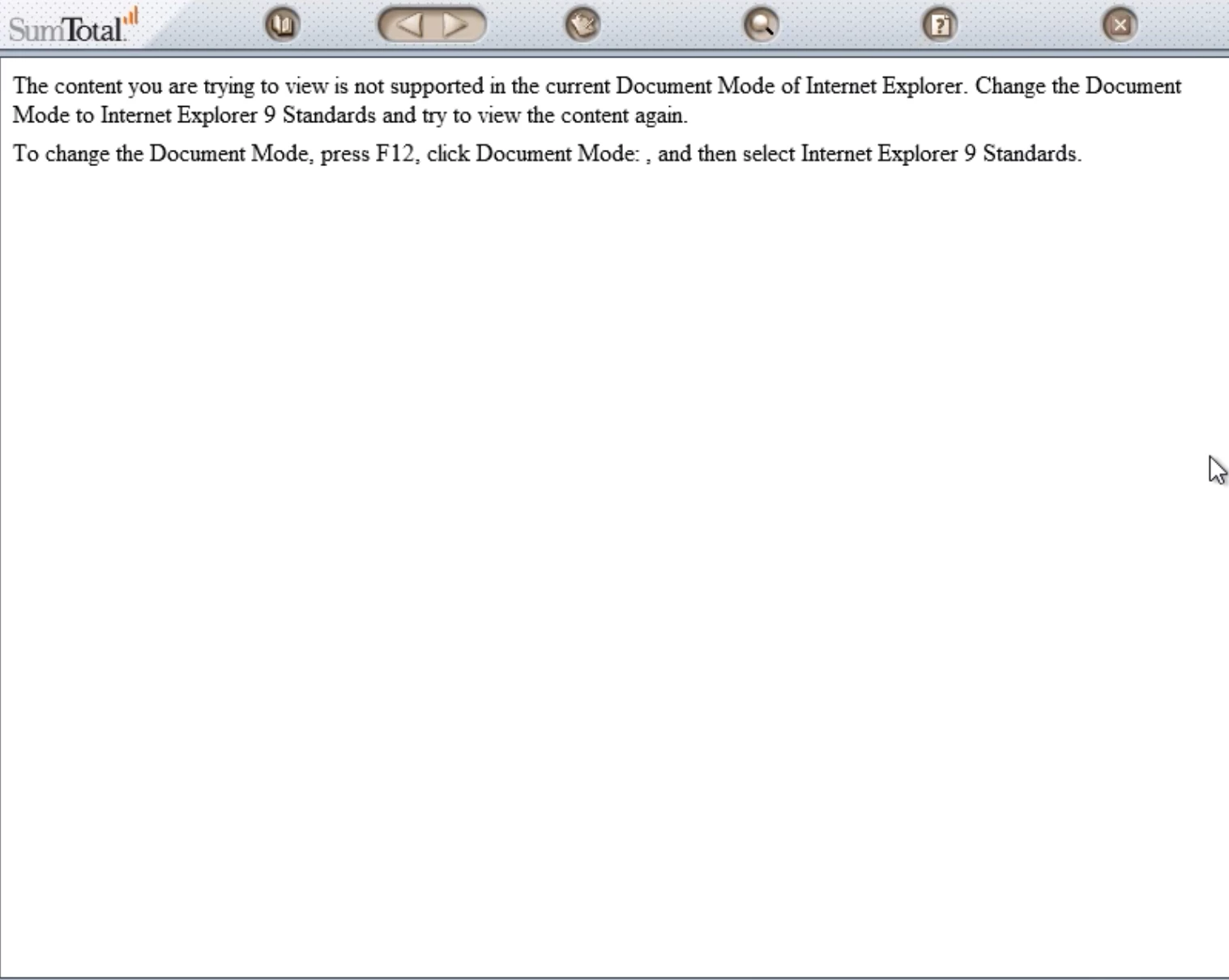 If IE9 is NOT your default browser version (which I strongly suspect) then you need to go back to your LMS people and ask them what they need to do in order to make your LMS HTML5 compatible. This would certainly require some kind of adjustment in the server settings or even perhaps the templates that SumTotal is using. There is absolutely NO reason why any organisation nowadays should be mandating support for IE9.