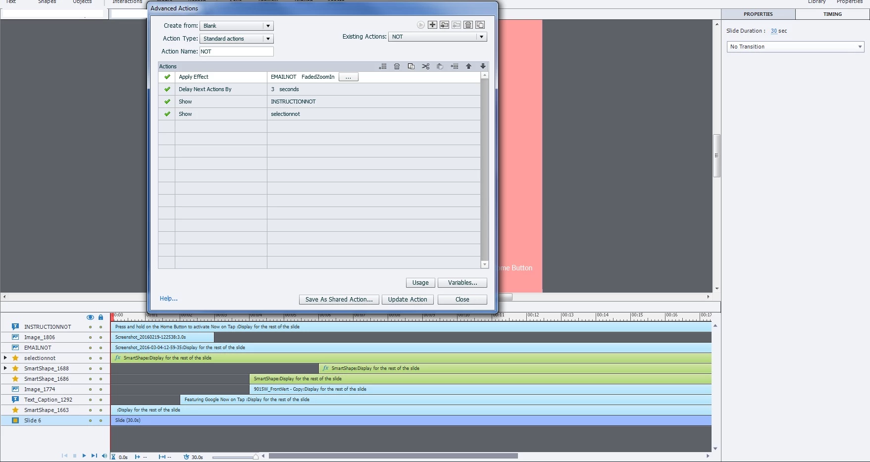 I am working on a Captivate file and I have an Apply Effect in Advanced Actions. I somehow have to click the button twice to get the element to show, even when I have "double click" unchecked in Timing.