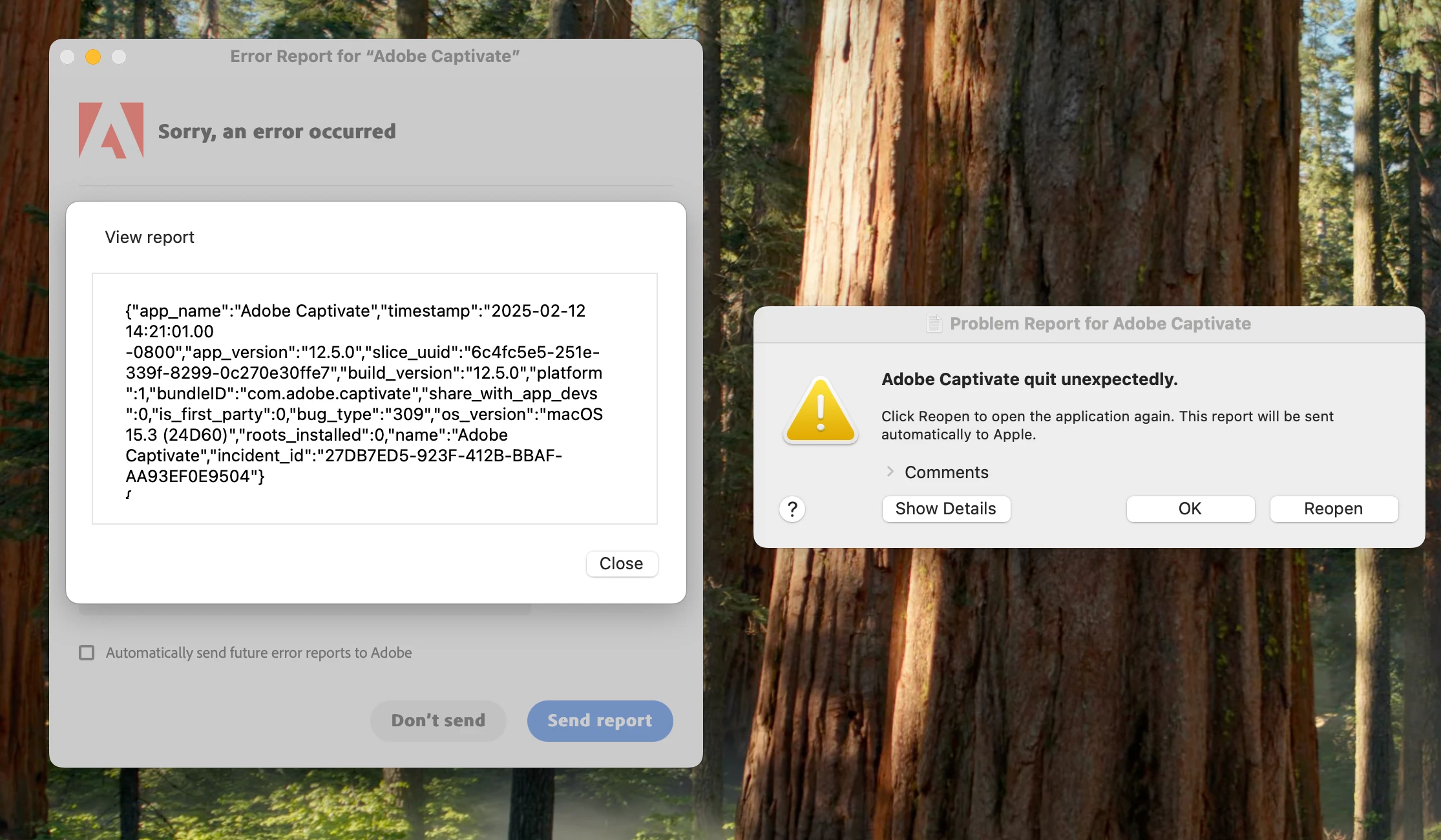 I figured that I would need to use the other available options but no matter which I choose, at the end of the recordingthe program crashes and an announcement that Adobe Captivate quit unexpectedly appears and the error report (which I attached here).