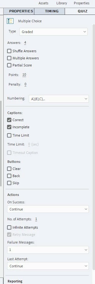 New to Captivate and have watched a ton of tutorials but I'm still unable to find where to indicate the correct answer for a quiz. I don't have any options under the Quiz properties to select the correct answer.