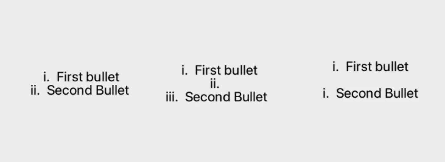 I am trying is use as numbered list with i, ii, iii, etc... when I push enter to create a space between i bullet and ii bullet I get the middle picture, but I want a blank space, so when I remove the bullet from the middle space, I get both bullets to be i. Is there a way to create the picture on the right with ii on the second bullet? I have version 11.5.5.676.