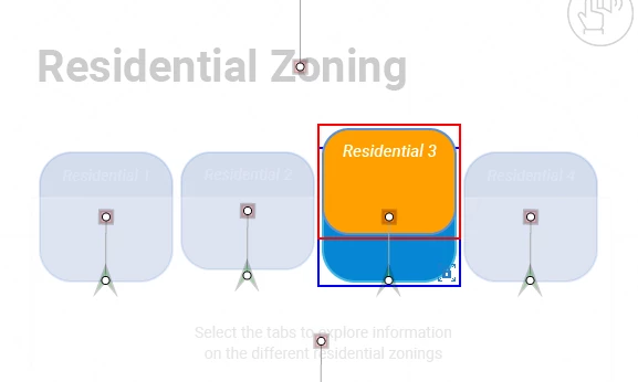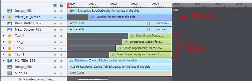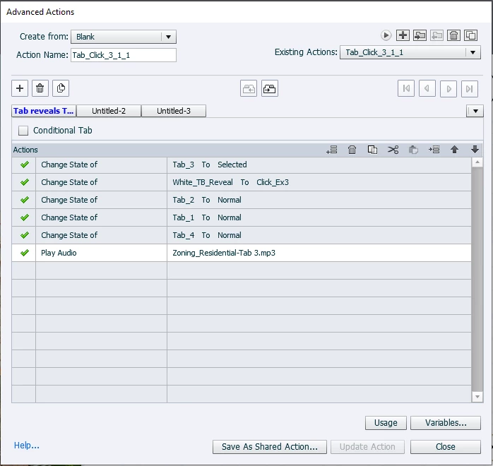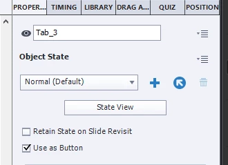 I have created a click to reveal tab interaction, with 4 buttons/tabs each triggering an advanced action, including changing a state change of one block object, and each tab has a 'clicked' state with a different coloured shape making the tab stand above the others:
