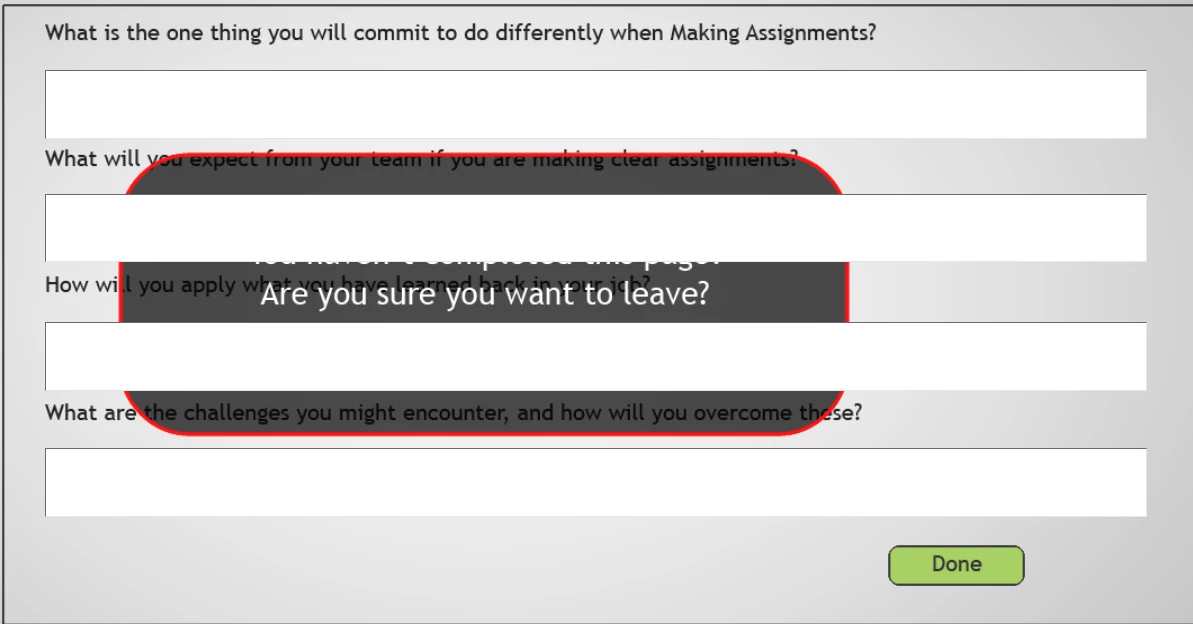 One of my slides has 4 Text Entry Boxes, and if the viewer tries to continue to the next slide without filling in all of the TEB's, a warning message appears to make sure they want to continue without completing the TEB's.