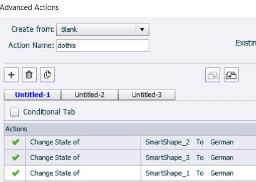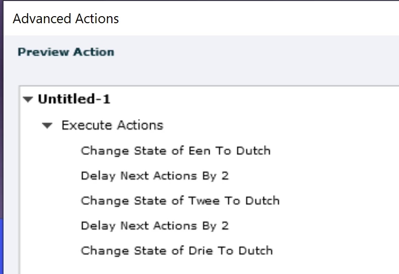 I have a project that requires closed captioning in 26 different languages. So I created several shape and gave it 26 states. Shape 1 should start at time 0, state 2 at tim 3 seconds and shape 3 at time 6 seconds. On enter to the slide, I have an advanced action that changes the state to say German.