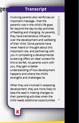 To make training more user friendly I’ve been using a text area widget on each slide for displaying the slide’s transcript. I’ll put an image behind the widget, group them together, and then show/hide the group with buttons. This is how it appears in the training.