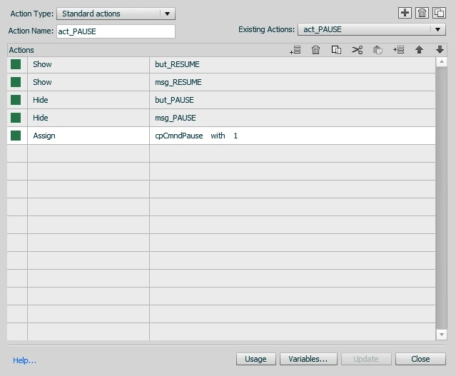 A. Script assigned to btn_Pause hides btn_Pause and the "CLICK to Pause" graphic, shows the btn_Resume and "CLICK to Resume" graphic, and pauses the project by setting the system pause variable to 1