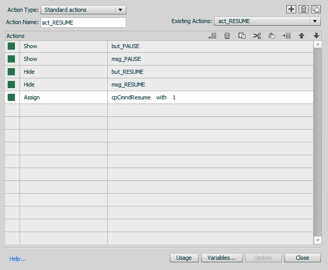 B. Script assigned to btn_Resume hides btn_Resume and the "CLICK to Resume" graphic, shows the btn_Pause and "CLICK to Pause" graphic, and resumes the project by setting the system resume variable to 1