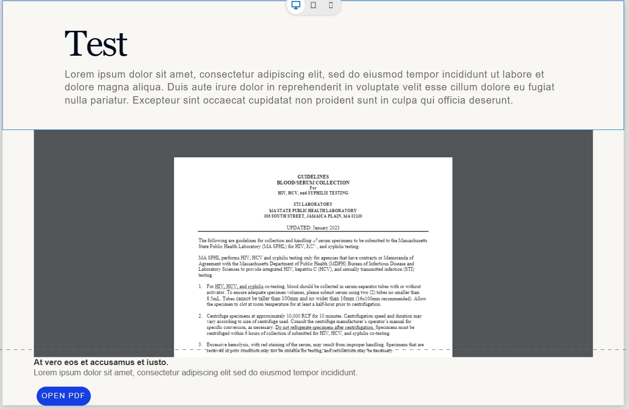 I'm hoping that I am able to use the button in the webobject block to open the PDF in the iFrame in a new window. haven't been able to figure out how to make that happen. The button wants to be configured to access a URL or a PDF hosted somewhere. Maybe I should be doing this another way? Any ideas out there?