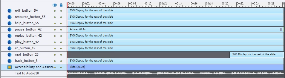I don't think the Timeline panel shows up completely. So far I see only one pausing point on the Pause button at around 27secs.This means that the playhead will be paused at that moment when it gets to that frame. But if the learner clicks the Play button when the playhead is paused at 27 secs, the pause will be overridden of course.