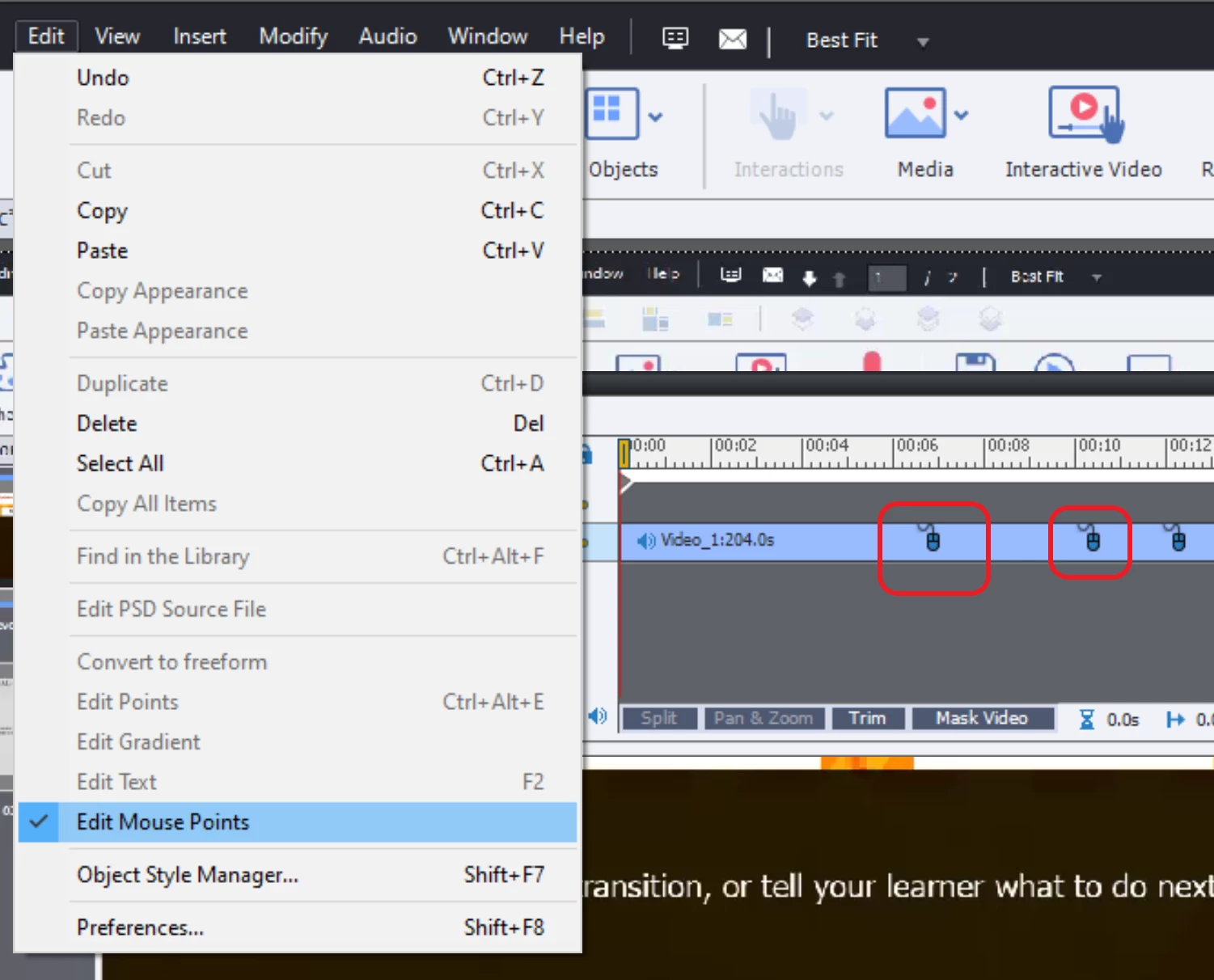 Il est parfaitement possible d'accéder la souris dans un projet cpvc. Je l'ai déjà mentionné dans ma réponse précédente. Il y a deux modes d'édition dans l'éditeur Video Demo. La mode qui se présente automatiquement permet 'Pan and Zoom'. L'autre mode, accessible avec Edit, Edit Mouse points, permet d'éditer les instances de souris.