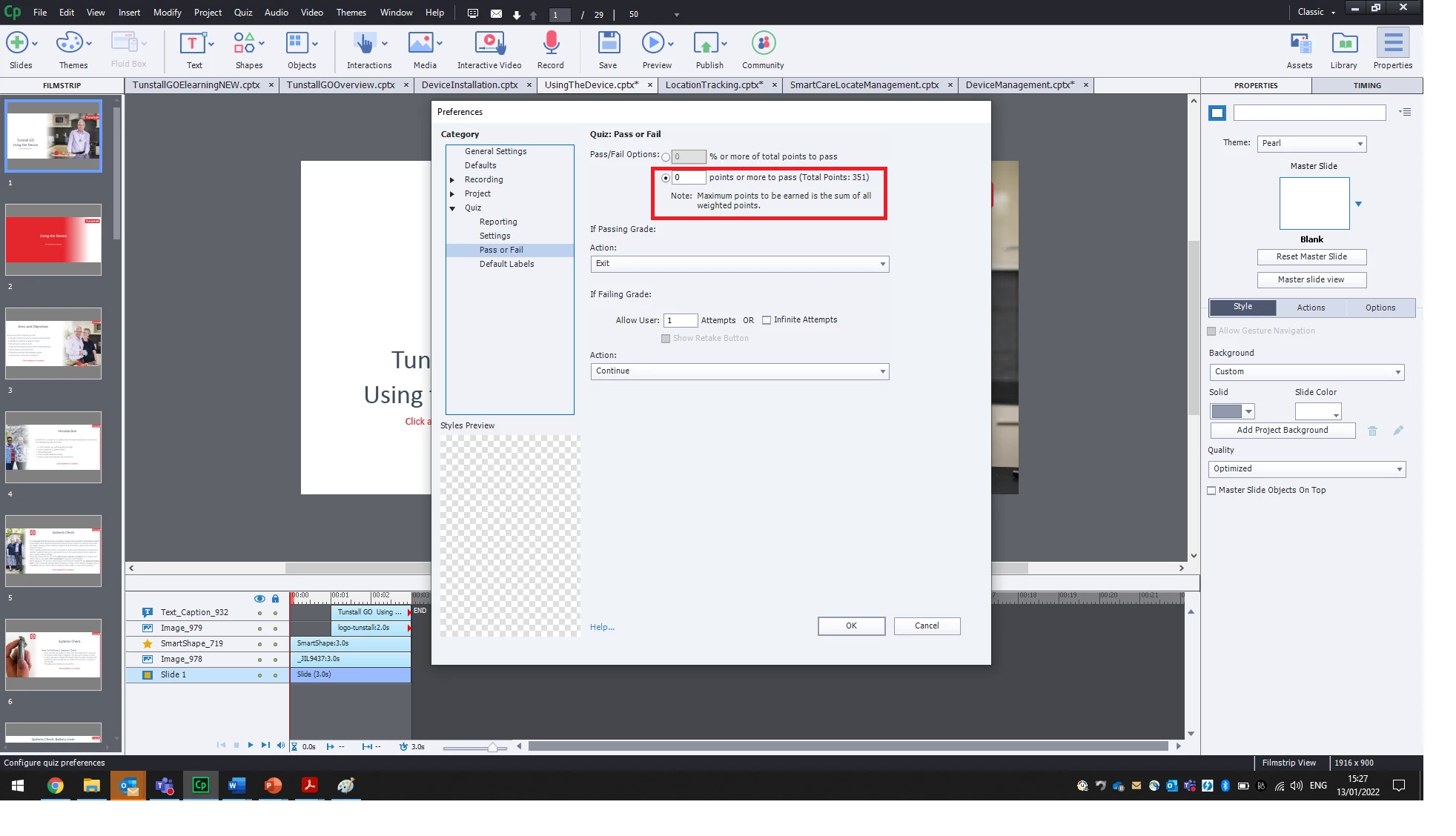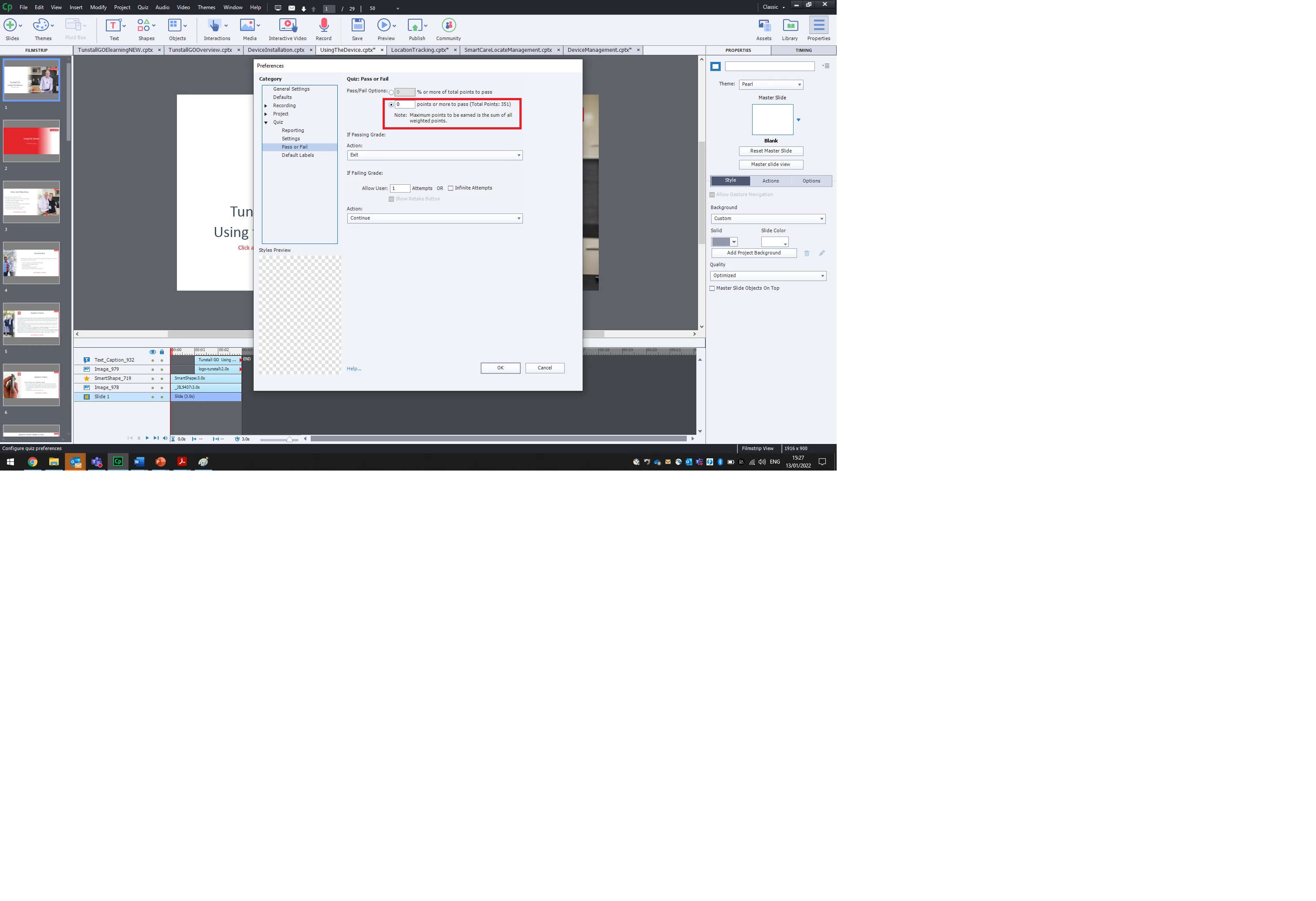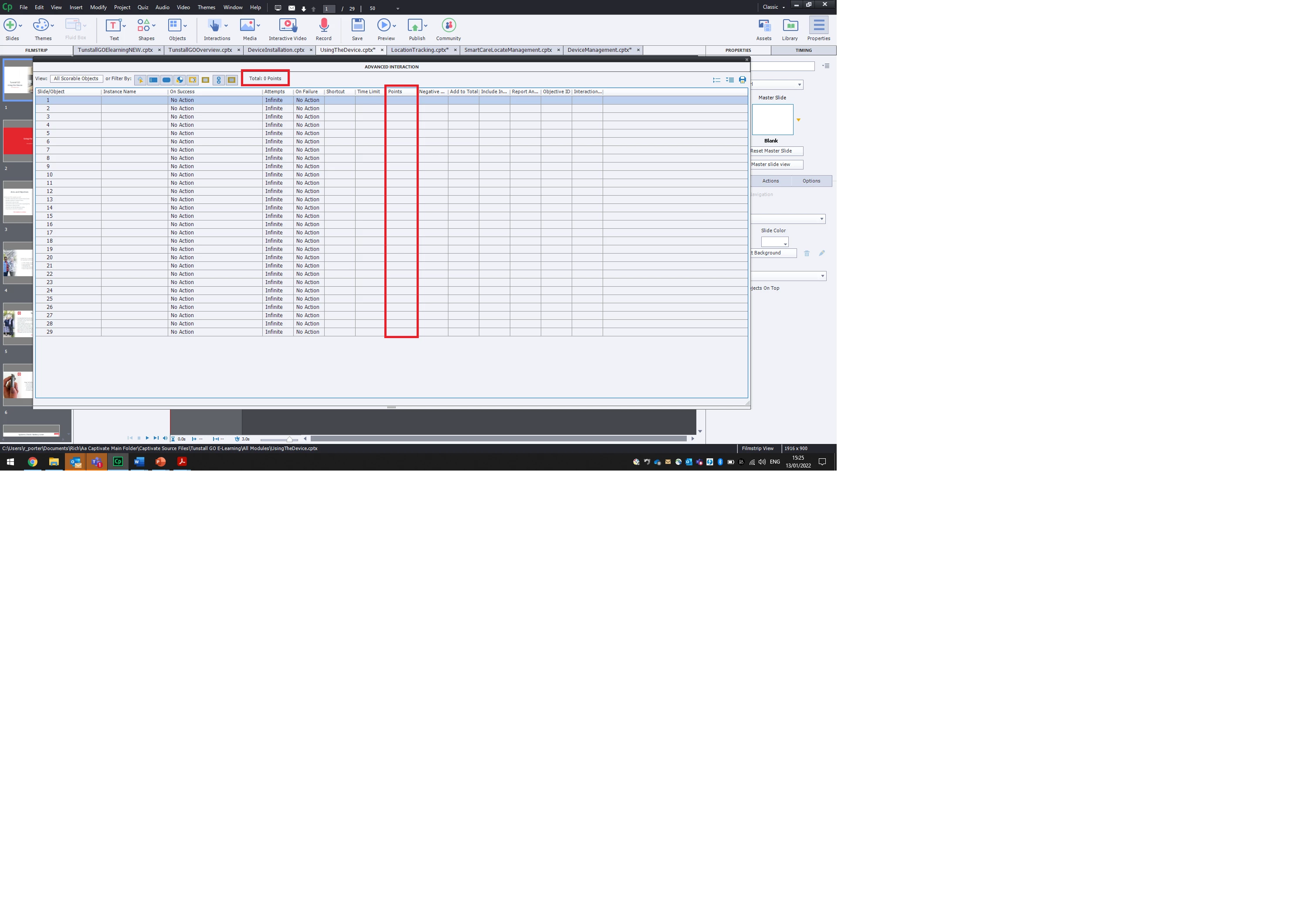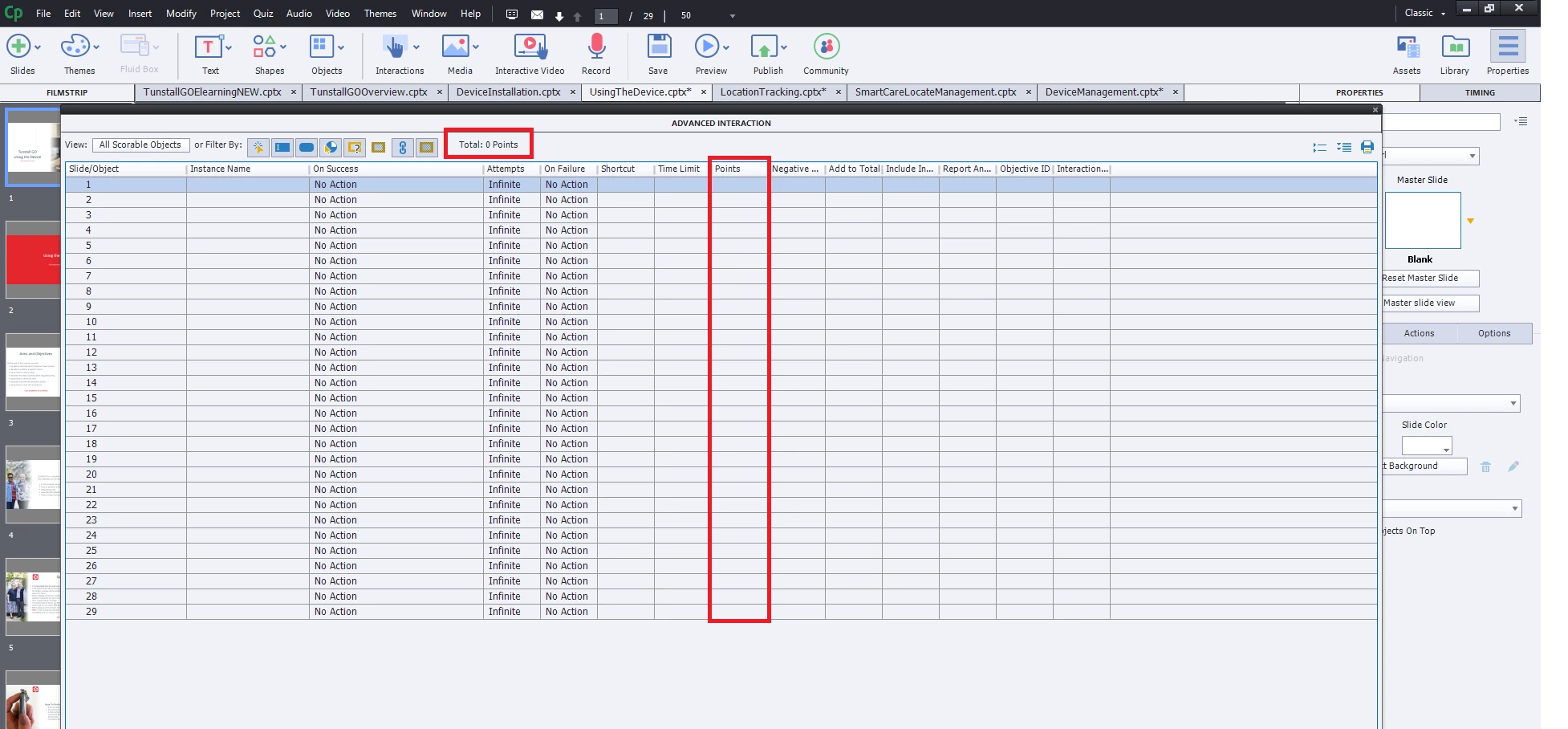 So my issue is I have a project with 351 scorable points and nothing showing on the Advanced interaction menu (seen below). So I used to have click boxes that had a value assigned for the quiz so that if a user clicks it adds one point then once they reach the end and they have accumulated all the points the quiz is "Complete" and they can move onto the next module on the LMS. I am well aware of the pass once all slides have been viewed but this project has been modified that many times to try and get it to work on the LMS I have obviously done something wrong.