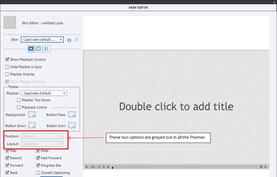 Hence I cannot move my play-bar around. I tried choosing all the default skins in Captivate 2017, but still these two options are grayed out. How do I make them editable?