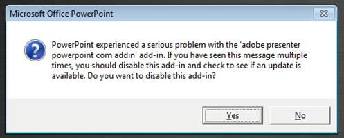 Powerpoint has encounterd a serious error in the add-in Presenter, do you want to disable it?