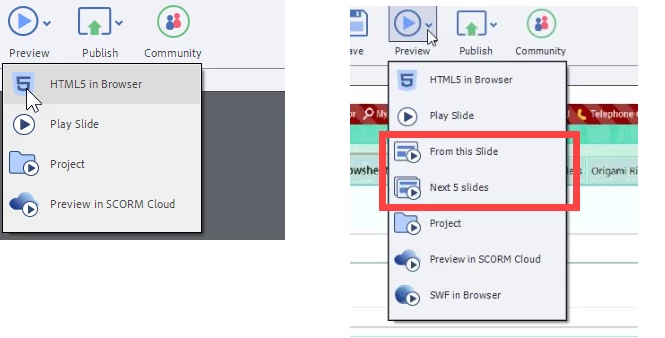 You are working on a non-responsive project. The only valid Preview method since the death of the Flash player was F11, Preview HTML in Browser, which I have written over and over again in this forum. Now the team took out the non-valid Preview methods. There is now even a bug in UI IMO: Preview Project and Preview HTML in Browser are both doing exactly the same, hence their sharing the same Shortcut key F11. Play Slide is NOT a preview method as you probably know.