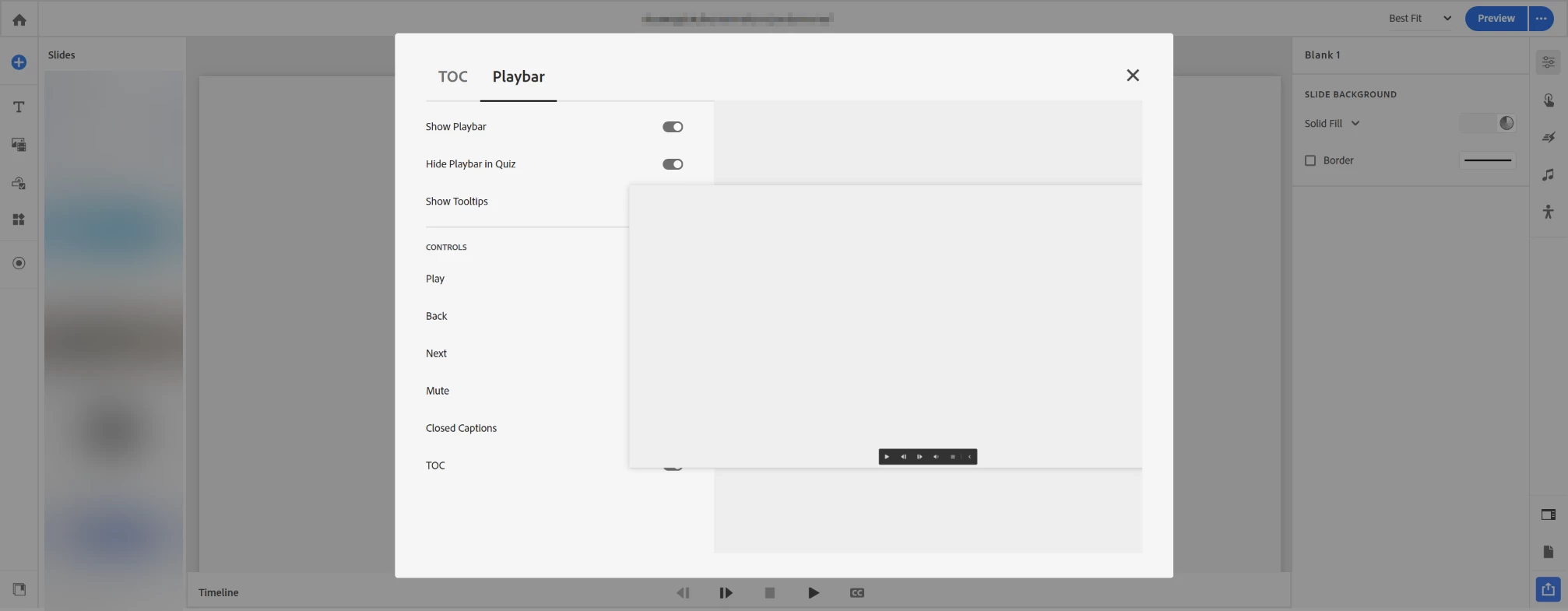 I'm in the Trial period for Captivate and seem to run into an issue. When I try to change the Playbar controls, the preview screen is blocking the controls sliders. Because of this, I cannot choose to turn certain buttons in the Playbar on or off. The same happens on the TOC tab. I cannot zoom in or out on this page, and changing the window size does not work either. Has anyone run into this before and know how to fix this?