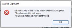 We are having a problem with our Adobe Captivate software, where it will no longer print project handouts, lessons, step-by-steps, and storyboards, because Captivate uses .DOC Word files as the template and we can no longer open that file type with our enterprise upgrade to Office 365. Even if we upgrade or replace the template files with .DOCX files, the Captivate application only allows the selection of .DOC files.