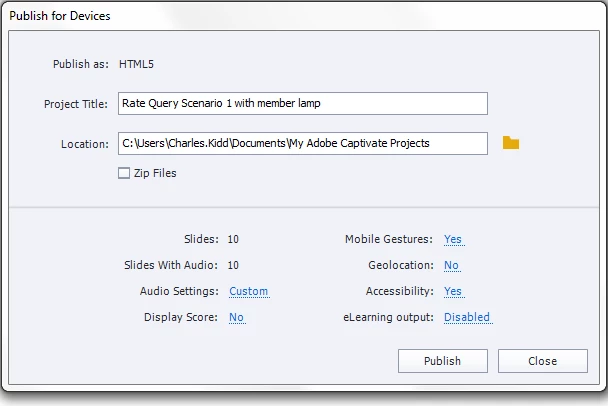 I have a file that I would like to publish as executable. When I click on publish, there is usually a drop down menu that I could select executable from. In this instance, there is no drop down menu and the file appears to be defaulted to HTML5. How can I publish as an executable file? Thanks for your help. This is the image that comes up and I'm use to seeing the drop down menu next to Publish as: