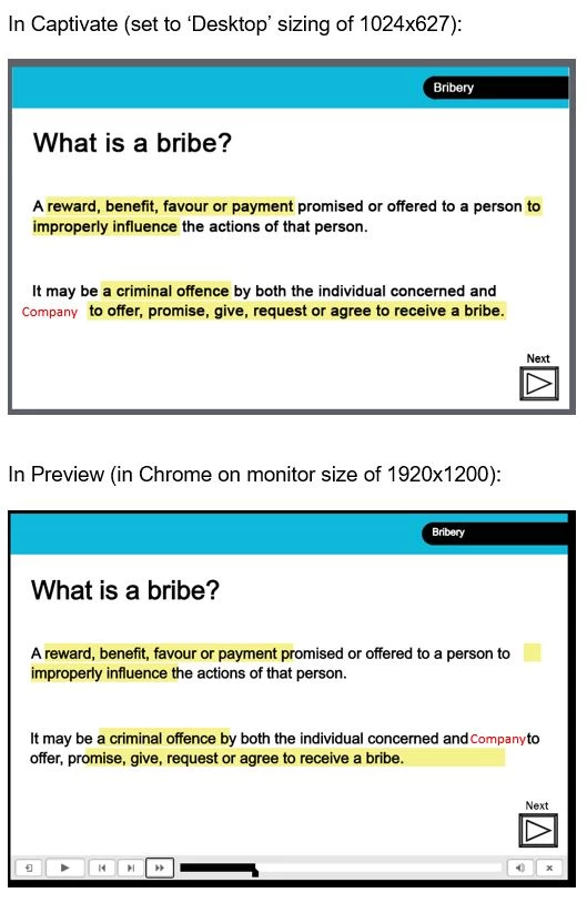 I am looking at my project in Captivate and - on screen - I have animated boxes that aim to highlight key information (see yellow bars in screenshots below). When I go to preveiw the session in Chrome, the highlight boxes have shifted so they look a mess! Any suggestions as to why this is and how I can fix it?