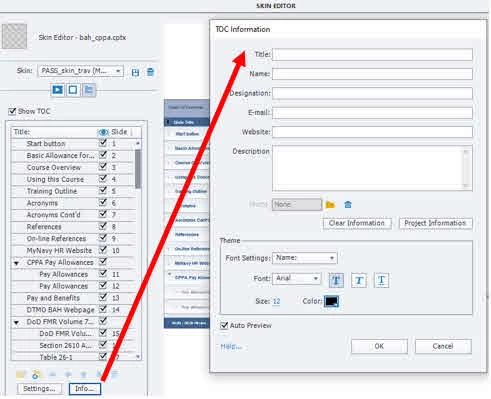 2. Project > Table of Contents > "Info Box" > TOC Information (contains entries for Title, Name, Designation, E-mail, Website, and Description). This screen also has some Theme settings and a button titled "Project Information" which copies some of the fields from item 1 above, though the titles don't always match 1 for 1.