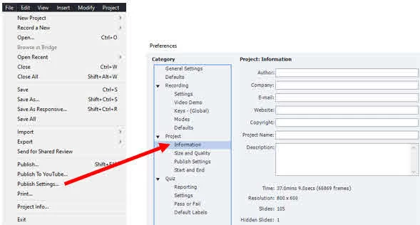 1. File > Publish settings > Preferences > Project > Information (contains entries for Author, Company, E-mail, Website, Copywright, Project Name, and Description). This window also displays Time, Resolution, Slides, and Hidden Slides.