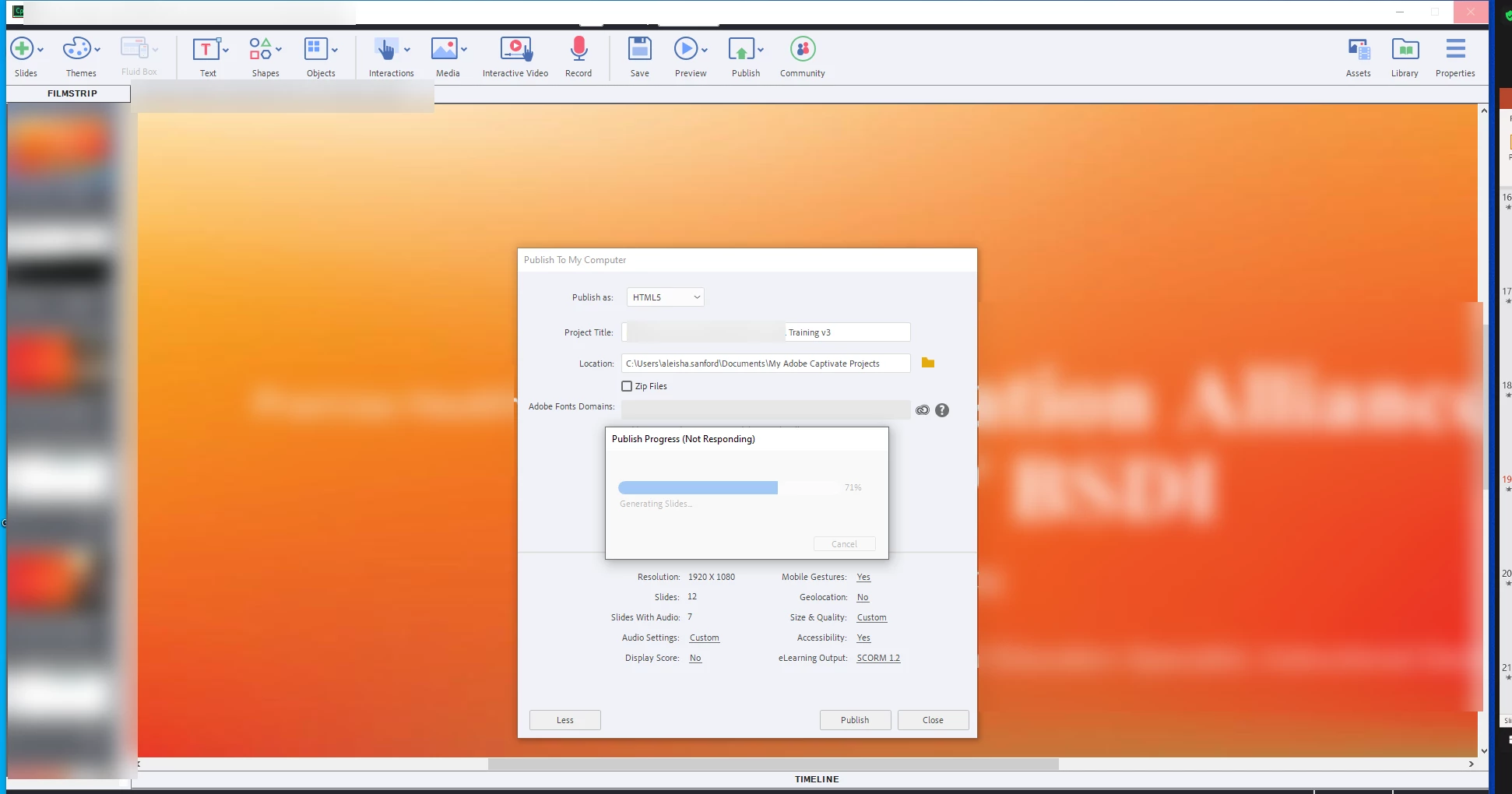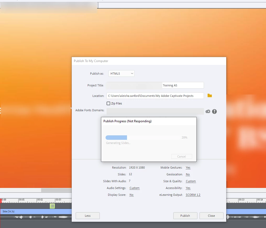 I have been working with a new captivate video with slides and demo only. When we publish it will go through about 28% and Captivate stalls. It shuts down or crashes. After several attempts (I am on version 7) it goes to 42%. We tested it by removing some of the demos and it would publish but some of the other videos would be blank in preview. My question is how can we determine if 1 or more of the videos are currupt?