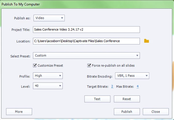 I have a project that contains slides without audio, slides with embedded MP4 audio and slides with audio recorded to the slide from within Captivate. I preview the file in browser and everything is perfect. I publish the Captivate file to a video and the audio from several slides plays at the same time instead of in the order established. The options I choose when publishing are in the image below. Any ideas?