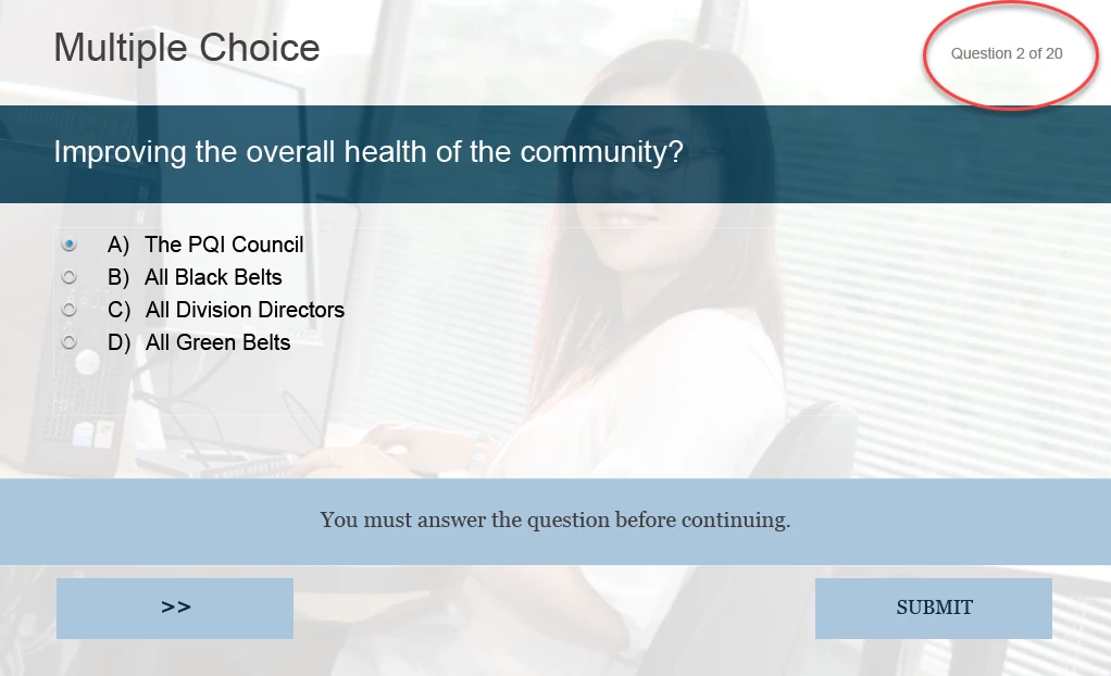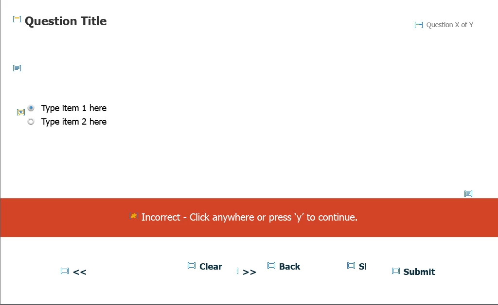 I'm currently developing a Quiz for an online course and have used 3 test questions from the assets section; they are multiple-choice, True or False, and Matching; they use the Alliance theme. These questions have a Progress Indicator Placeholder that reports "Question X of Y," located in the upper right corner on the master slide.