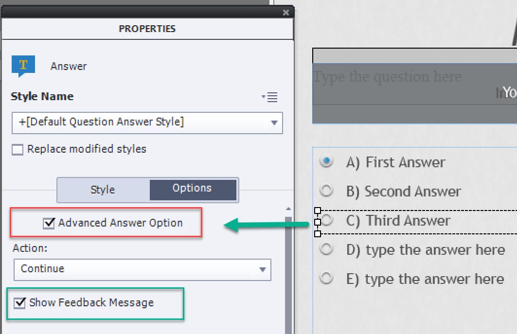 The reason I set up a Quizzing workspace is due to Advanced Answer option and partial scoring/penalty (with Propeties panel in the left docking station and Quiz Properites in the right docking station). To see Advanced Answer option you need select an answer contgainer, go into the Properties panel and you'll see the option Advanced Answer there. It is the same in 9 and 2017: