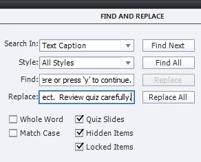 I have created 7 lessons with a combined total of 185 questions. After testing my project and a request from the client they want to default label to change. Instead of the default - For example...I need to change to "Incorrect. Review quiz carefully." I change the label in the quiz prefs but how do I update the question sides with the new label?