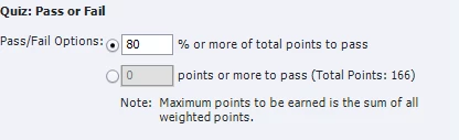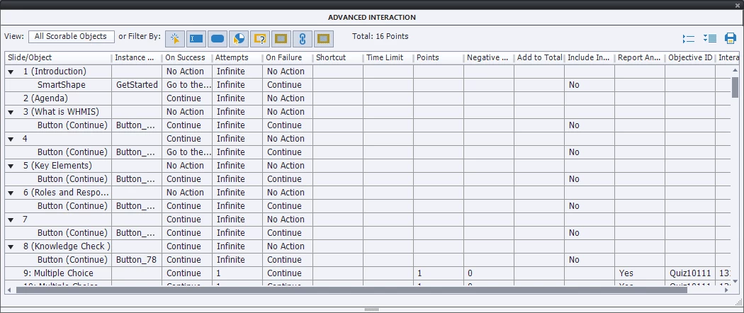However in the pass/fail section of the edit preferences it is showing my course has a total point value of 166. I have checked to see if any of the click boxes and buttons were included in the quiz and none of them are. According to the Advanced interactions window there is a total of 16 points.