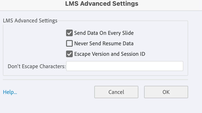 The project settings are set to send Resume data so that a learner can exit and go back in and pick up where they left off. I just tested this in Scorm cloud and it works fine.