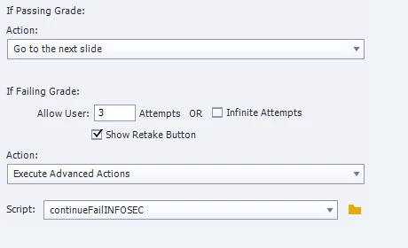The problem with the current course is the Continue button after first failure is active and goes to the next slide which tells them they passed.