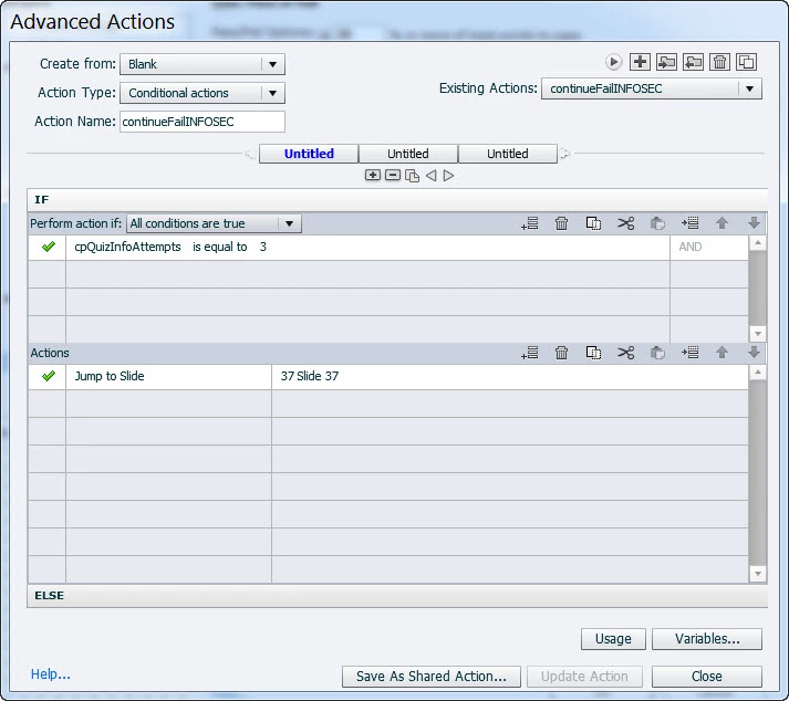 I needed to create the same type of course, with a quiz and have the quiz results page work in a specific manner. Its actually kind of a simple concept. 2 failed attempts on the quiz then you are locked out. The quiz results page on the previous course displayed only the score information, and a continue button and a retake button. Same thing I want to do now. I found out last year from your great answers that the pass fail actions in preferences actually drive the continue button. I have two slides after the quiz results. One for when you pass, the continue button goes to a page that says you passed and you can either exit or restart the course. The very last slide (slide 37) is for the continue button to send you there if you have failed both attempts. The failure slide indicates you have used all your attempts and to contact your director. In last year's case, after the first failure the continue button was inactive. This was acceptable since the retake quiz button worked fine and the quiz result page indicated the learner had failed.