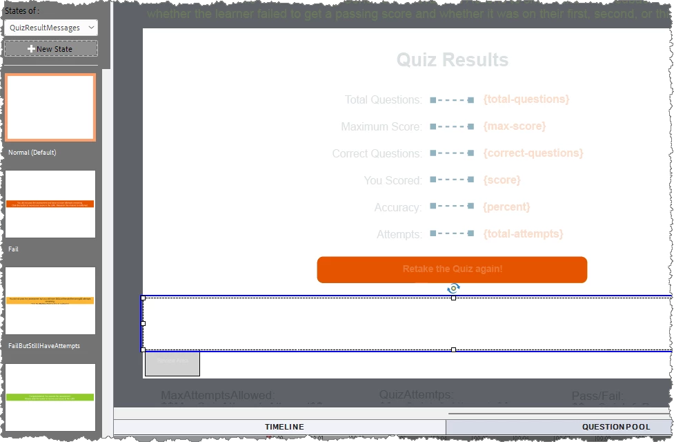 Quiz Results slide 'Review area' - I want to bypass built in text box and create my own?