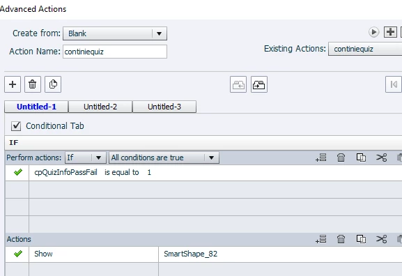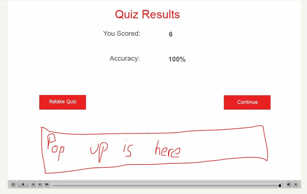 Ideally; when the user passes the quiz, the 'congrats you passed, please click continue' will pop up on the quiz results slide...and vise versa for the fail popup.