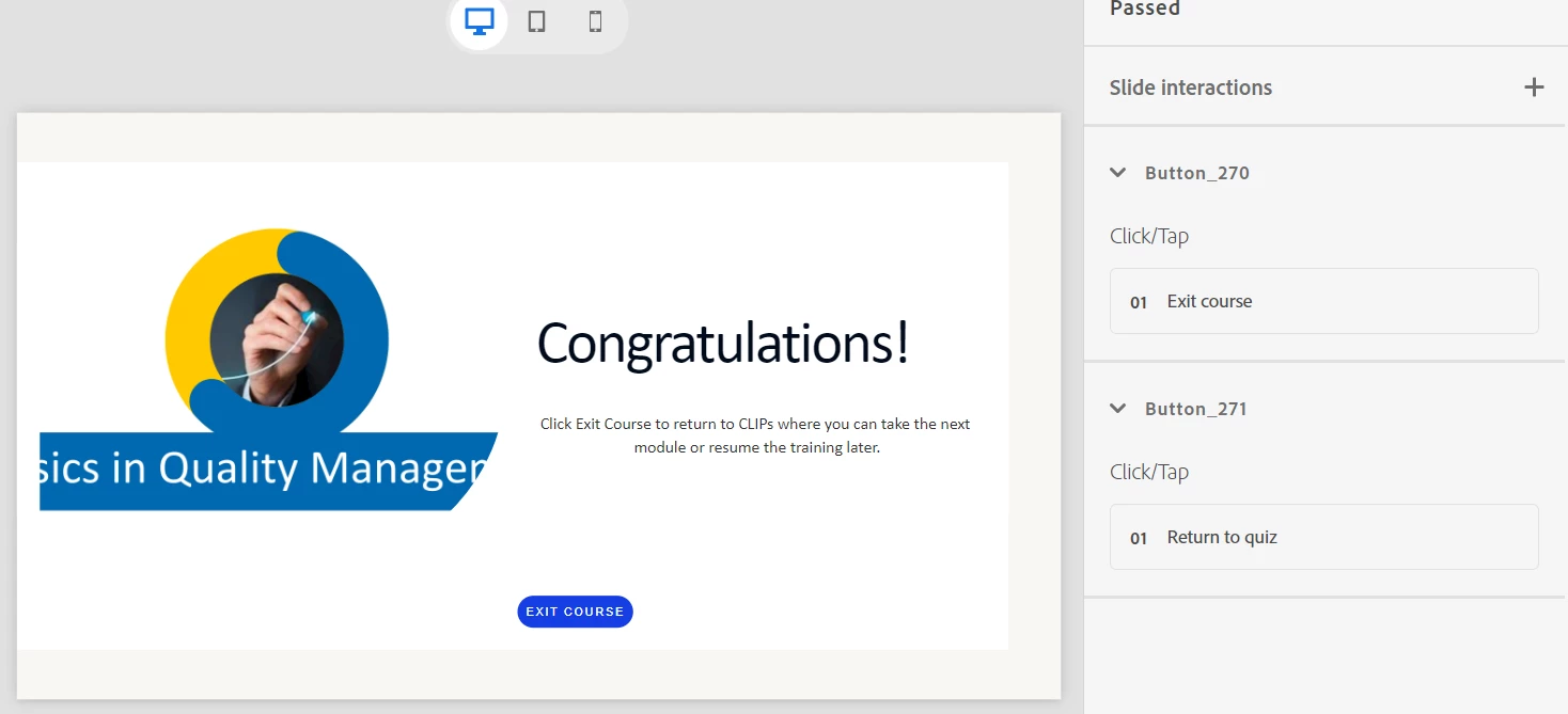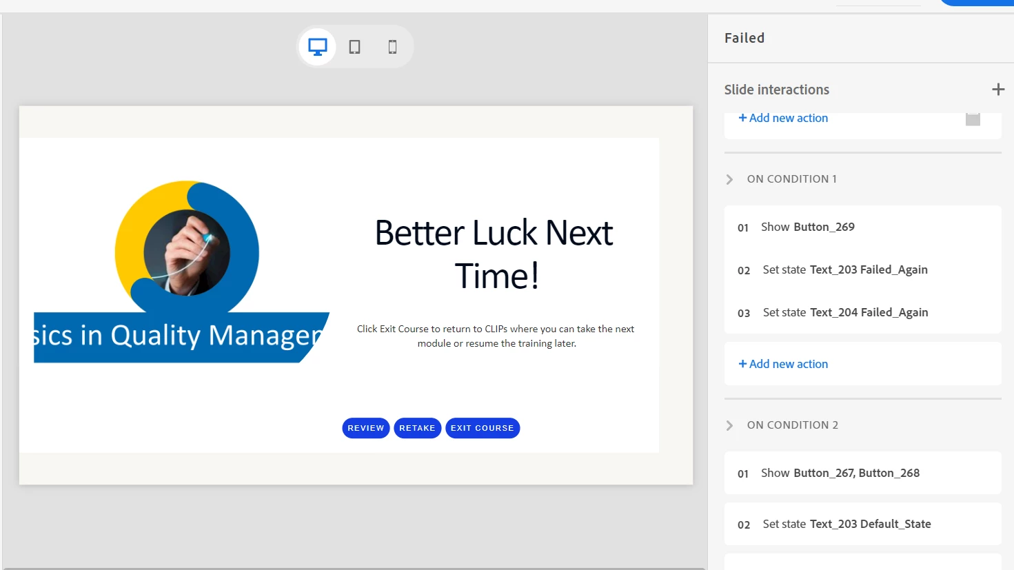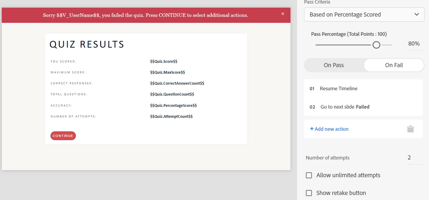 Quiz Review slide failure action only supports Return to Quiz or Exit Course