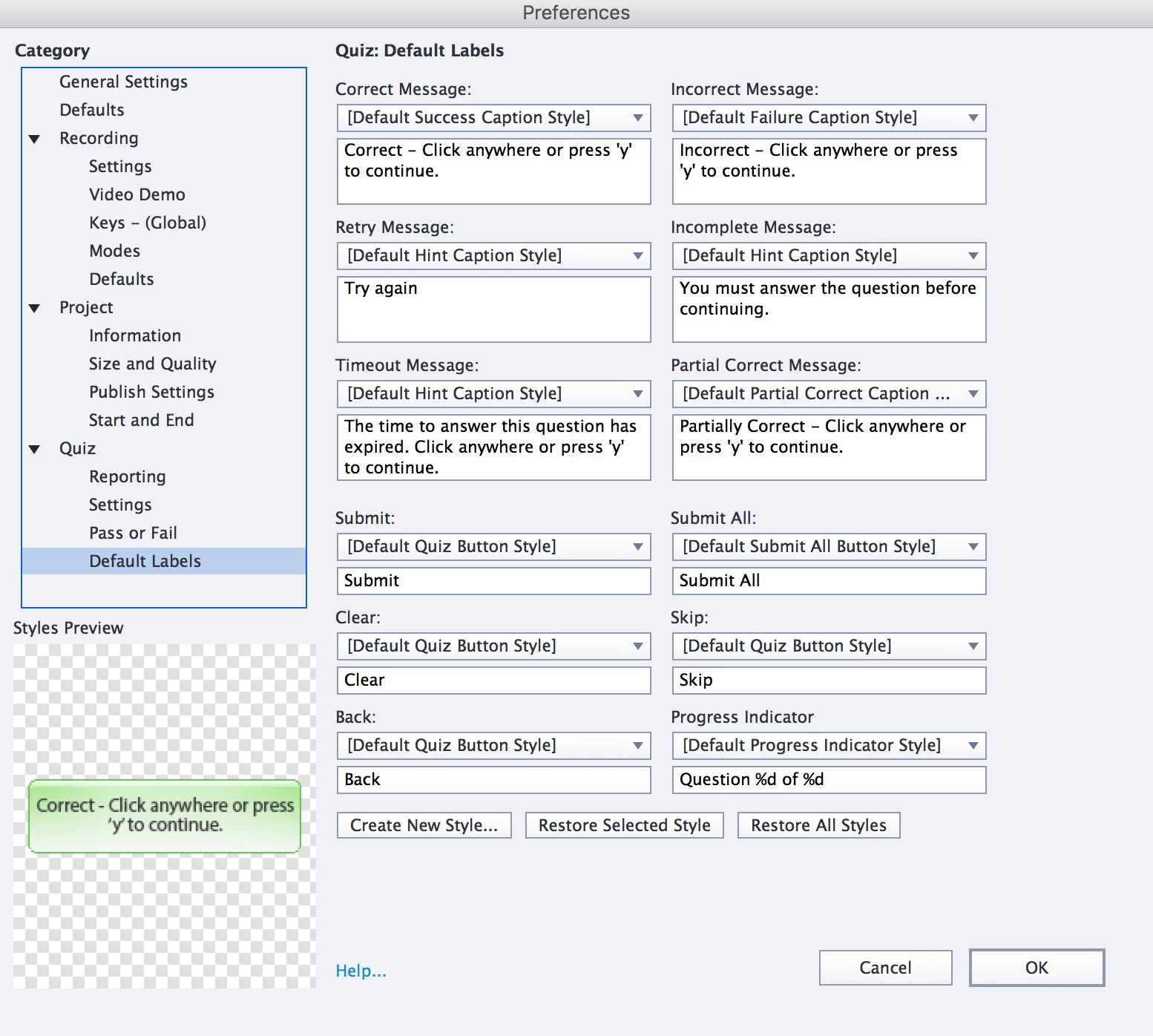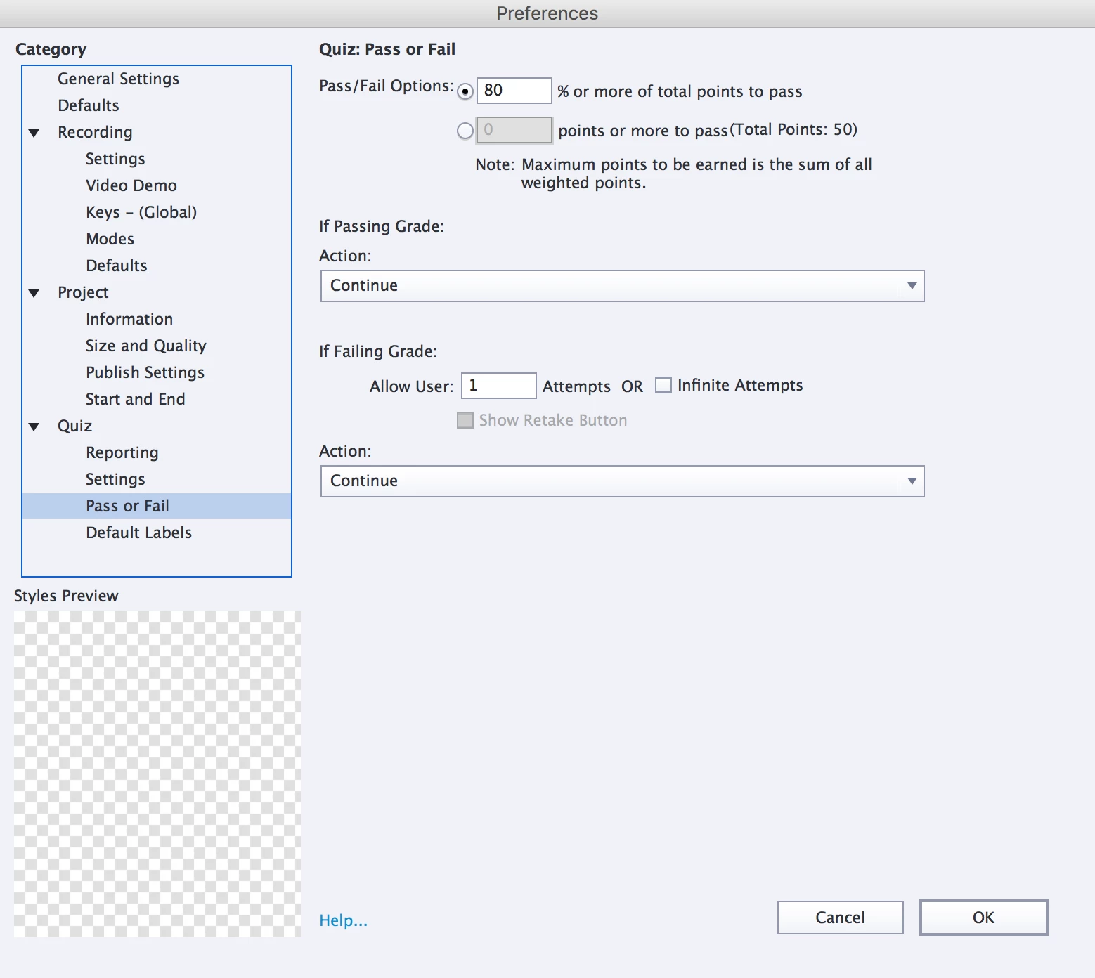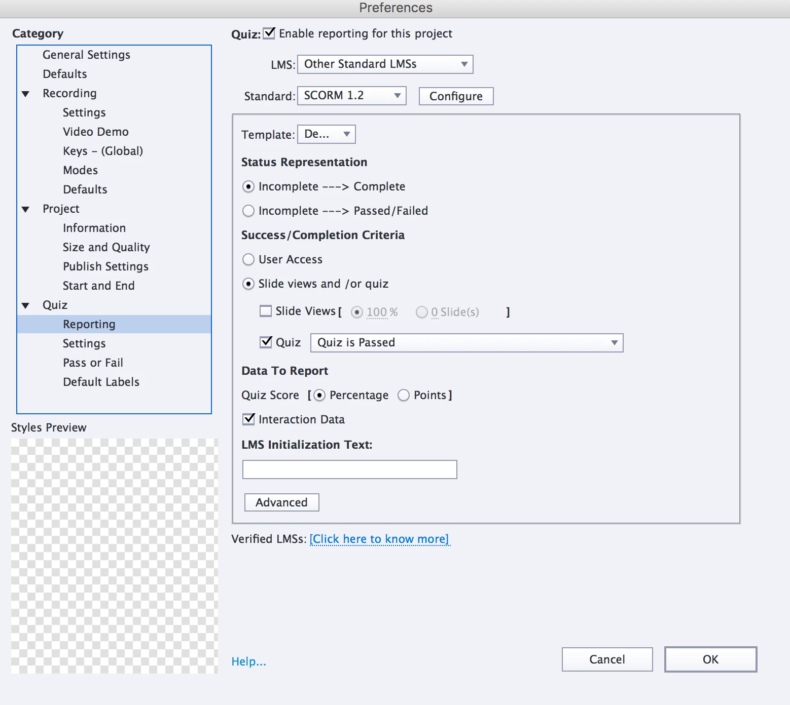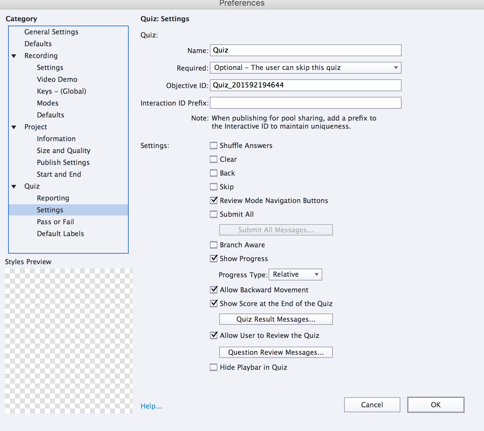 This is how I have my preferences set for the Quiz. When this quiz was uploaded to the LMS in September, there were no issues but now in December there are issue and I didn't change any of the settings to this quiz, just updated some text on a slide. Any help on what I may be doing wrong is very much appreciated! Thanks.