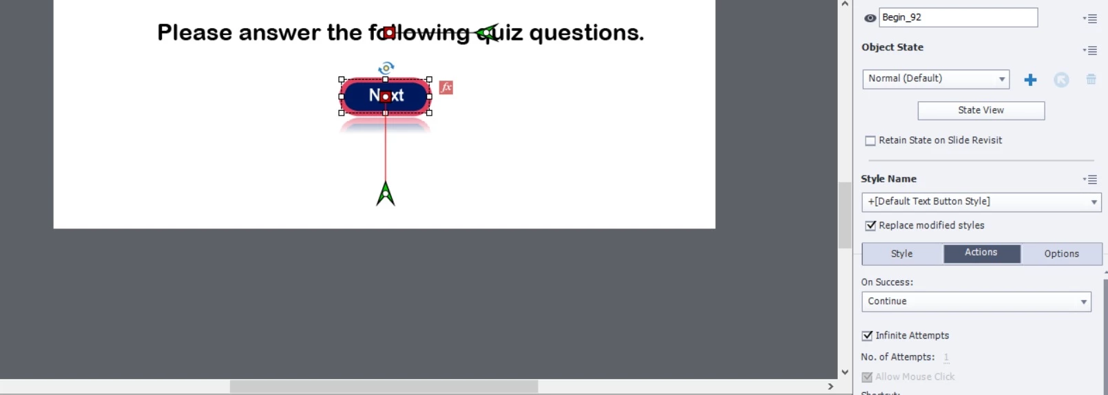 So, if you find that you have removed these objects, rebuild your quiz questions again. One quick way to get the missing objects back is to select the Quiz slide in the filmstrip and then hit the Reset Master Slide button on the Properties tab. That should reset the layout of the quiz slide back to standard (unless you have also removed these objects from the Quiz Master Slides, in which case things are more complext).