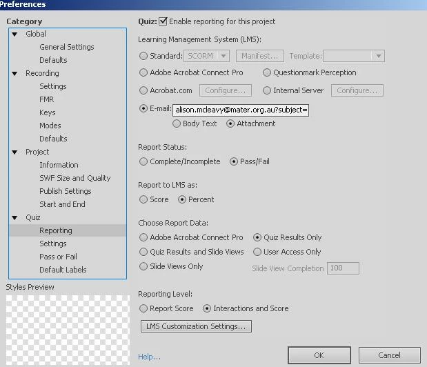 set the reporting options up: The quiz when published displays the results page that appears to be working - I just need to get the results to be submitted via email.