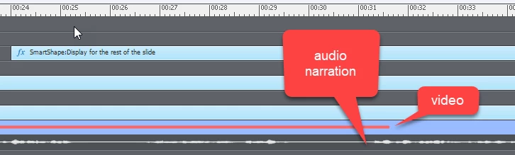Thank you for your response, Libybiri. Yes - I"m talking about a video demo (or screencase video recording). I find it a lot easier to do the video demo, then add audio narration and other images to the slide later (like arrows or other images) - I've added a screenshot of the timeline below. You'll see that my video ends, but I'm still narrating and pointing to images on the last video shot. The intention was to keep the final image of the video on the screen, but the problem was that the video looped to its beginning again. I was able to fix the looping by moving the END marker so that it was just before the transition marker at the end of the video (second screenshot below).