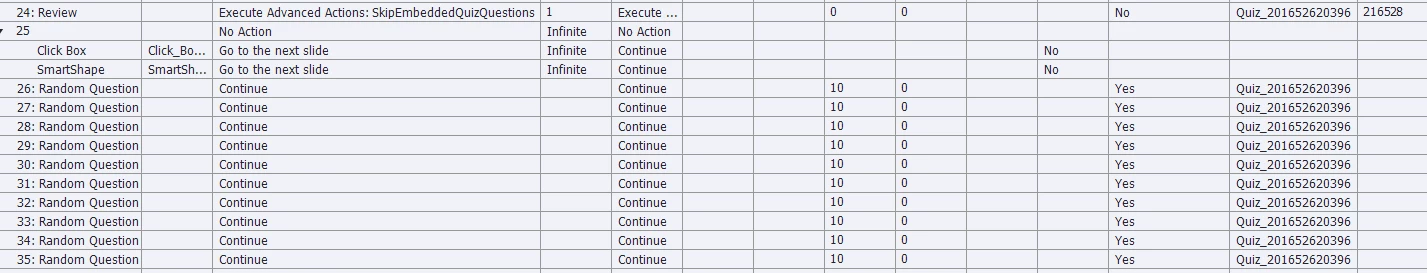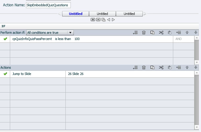I tried the cpQuizInfo...variable on the two quiz questions that I want to exclude, and created a condition that says that if they if the agent receives less than 100%, jump to page 28, else continue. This did not work.