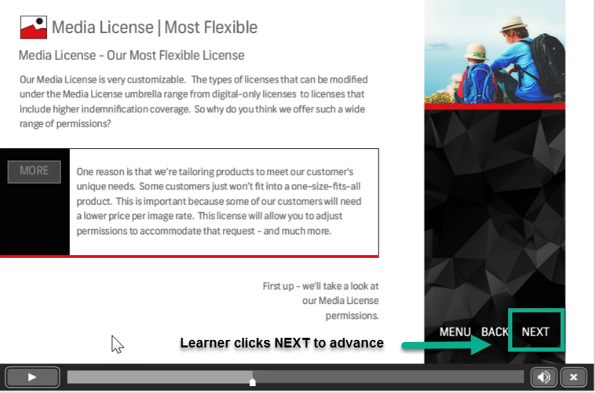 Once the learner is done, they hit NEXT to advance to the next slide. That's all good.