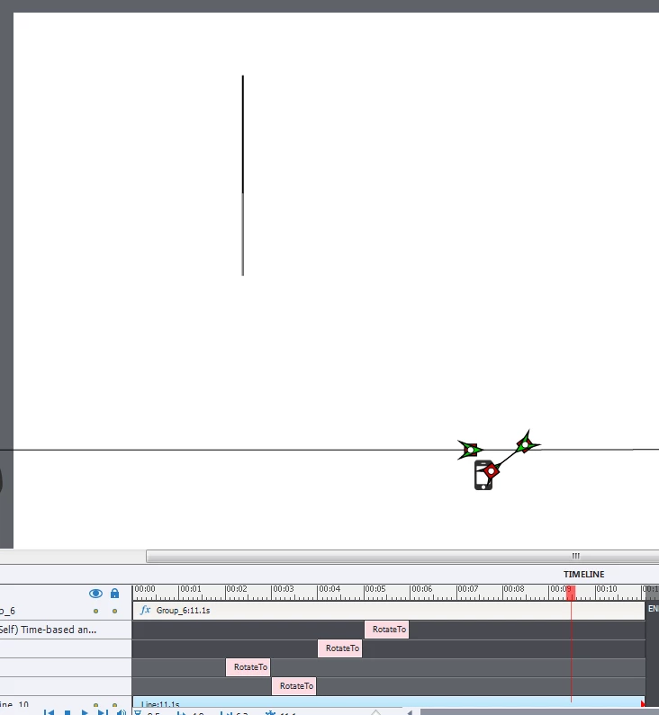 I'm trying to create a moving clock as a way to show time progression during a working day. I know I can't change the pivot point of a single line, so I've created two lines, made one invisible (minimum width, same colour as background) and grouped these. When I apply the RotateTo effect, it uses the meeting point of the two lines and the visible line appears to rotate like a clock hand.